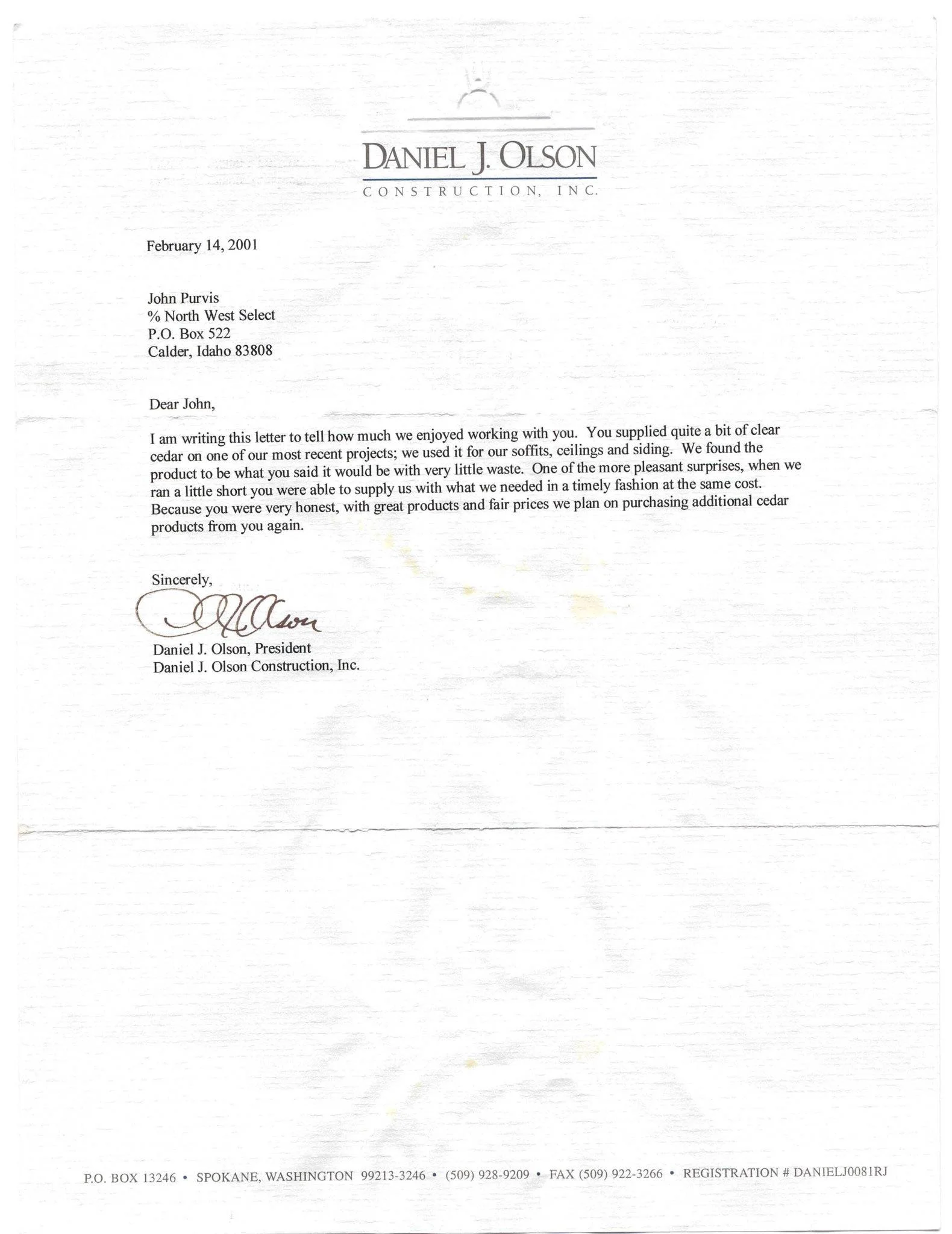 "This letter is to express my appreciation for the quality of the VG Cedar products that I have been able to obtain from Northwest Select. They have always provided a really superior product and I ahve also apreciated their service in delivery."